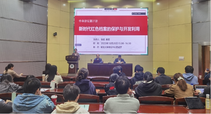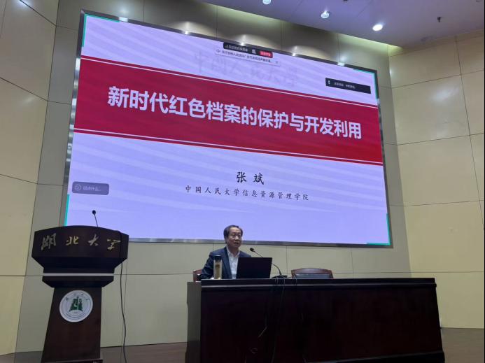 2025年10月20日下午,中国人民大学张斌教授应邀在湖北大学会议中心思诚厅,以线上线下相结合的方式,为我院师生带来了一场题为“新时代红色档案的保护与开发利用”的专题讲座。现场气氛热烈,吸引了档案系教师、2025级档案学本科生,以及24、25级图书情报专业硕士、信息资源管理学术硕士研究生踊跃参与。讲座由系主任李彩容副教授主持。