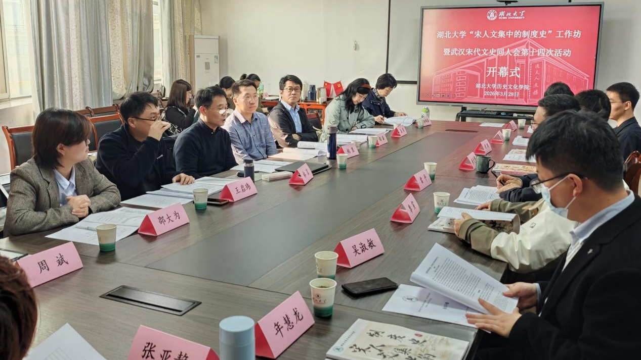 2026年3月28日,“宋人文集中的制度史”工作坊暨武汉宋代文史同人会第十四次活动在湖北大学历史文化学院举行。来自武汉大学、华中科技大学、华中师范大学、河南大学、中南财经政法大学、中南民族大学、武汉科技大学、江汉大学、湖北大学等高校的二十余位专家学者齐聚一堂,共同参与此次学术交流。