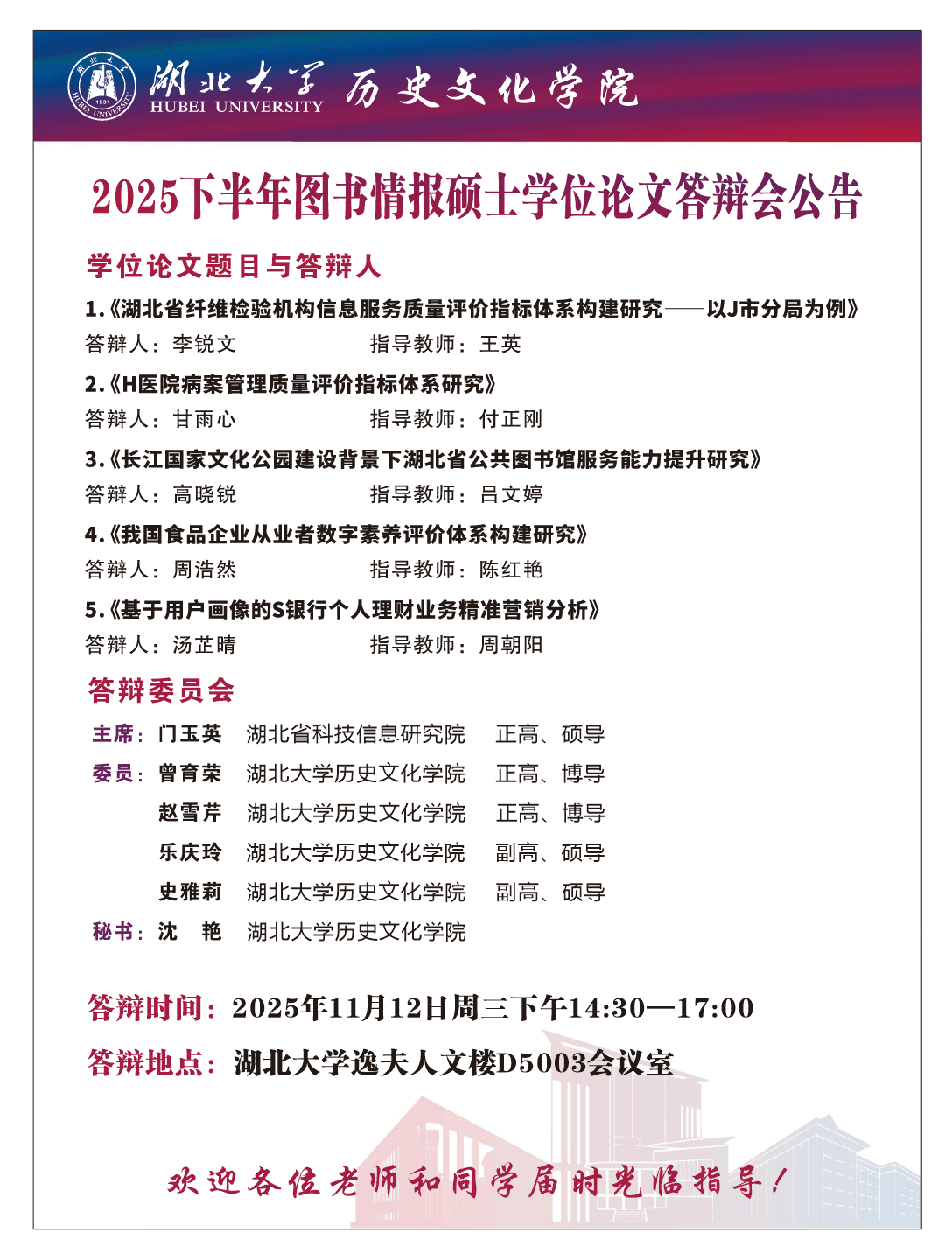 2025下半年图书情报硕士学位论文答辩会公告