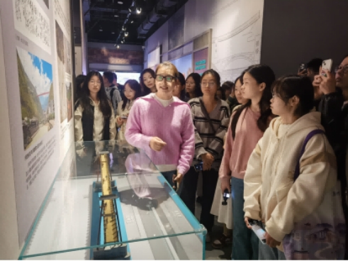 在中国桥梁博物馆,师生们在大桥局办公室档案科科长王明莉及其他工作人员的引导下,沿“古代桥梁—近代桥梁—现代桥梁”的历史脉络进行参观。王艳明老师现场教学,引导同学们聚焦博物馆的信息组织逻辑、展陈设计及数字化服务模式。同学们驻足于各类桥梁模型与文献展板前,结合专业所学,就历史文化信息的保存、分类与传播展开讨论。