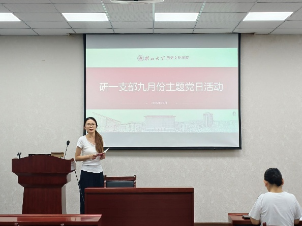 2025年9月12日晚,历史文化学院研究生第一党支部在D1013会议室组织召开九月主题党日活动。本次活动围绕“弘扬伟大抗战精神”与“深化作风建设”两大主题展开,支部全体党员参加此次活动。