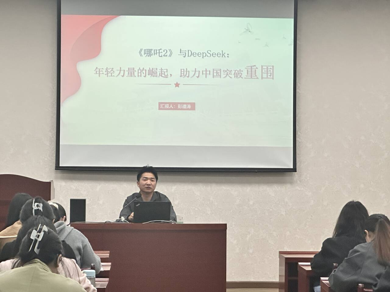 第三场辅导报告,材料科学与工程学院团委书记彭道涛老师以年轻力量的崛起,助力中国突破重围为主题来引导青年学子感悟文化传承与科技创新的时代力量,激发新时代青年的责任担当与创新热情。他以现象级动画电影《哪吒之魔童闹海》为切入点,深入剖析其背后年轻创作团队的创新密码。在科技领域,彭道涛老师聚焦人工智能企业DeepSeek的崛起之路,展现了中国青年科研力量的硬核实力。同学们从团课中深刻体会到,无论是文艺创作中的守正创新,还是科技攻关中的自主自强,年轻一代都肩负着“突破重围”的时代使命。