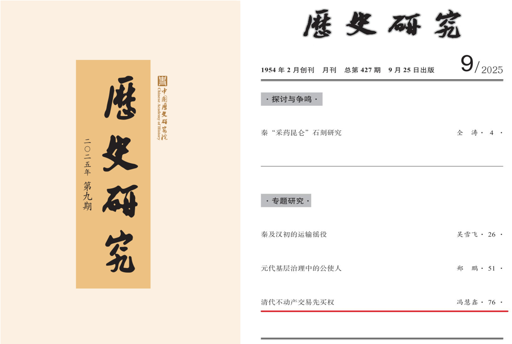 近日,《历史研究》2025年第9期刊发湖北大学历史文化学院历史系讲师冯慧鑫的专题论文《清代不动产交易先买权》。