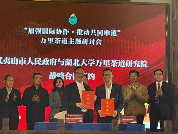 万里茶道研究院是湖北大学和中华文化促进会共同发起的科研和咨询服务机构。武夷山作为万里茶道起点,保存有下梅村、古茶园、茶厂遗址、古驿道及码头等诸多代表性文化遗产与自然景观。双方的战略合作,旨在深入挖掘武夷山作为万里茶道起点城市的历史文化价值,推动万里茶道共同申遗成功。同时,借助申遗过程推进武夷山“三茶”统筹发展工作,提升武夷山城市品牌影响力。